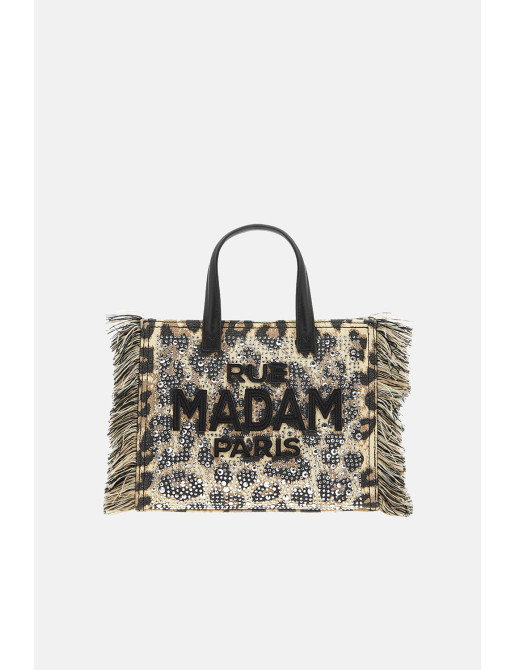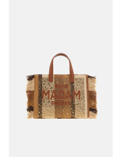 Mini Tote bag in canvas dal carattere deciso e glamour, impreziosita da frange e applicazioni di strass che donano luce e personalità al design. I manici e il logo in ecopelle aggiungono un tocco di eleganza, mentre la tracolla regolabile e rimovibile garantisce una portabilità versatile. L’interno è rifinito con fodera in cotone e tasca, per un’organizzazione pratica degli effetti personali. Dimensioni L 23 x H 18 x P 12 cm