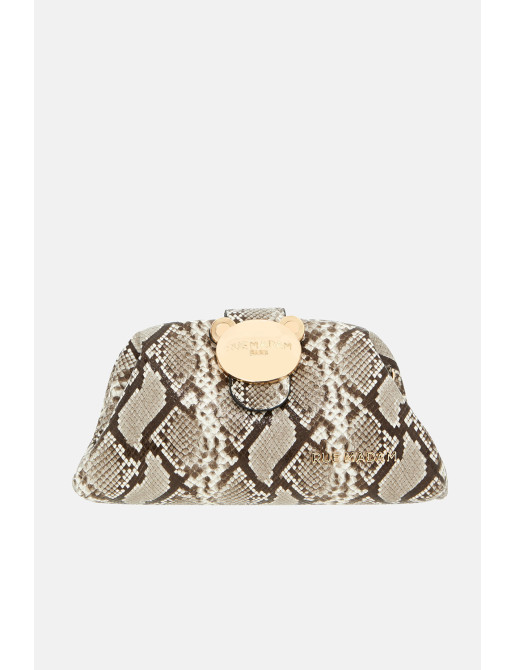 Pouch in ecopelle morbida con stampa pitone esotica, dal carattere deciso e contemporaneo. Impreziosita da una fibbia con orsetto e logo in metallo color oro, che aggiunge un tocco iconico al design. Dotata di chiusura magnetica, catenella removibile per una portabilità versatile e fodera interna in cotone con tasca per una perfetta organizzazione degli oggetti essenziali. Dimensioni: L 30 cm × H 16 cm × P 14 cm
