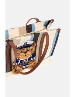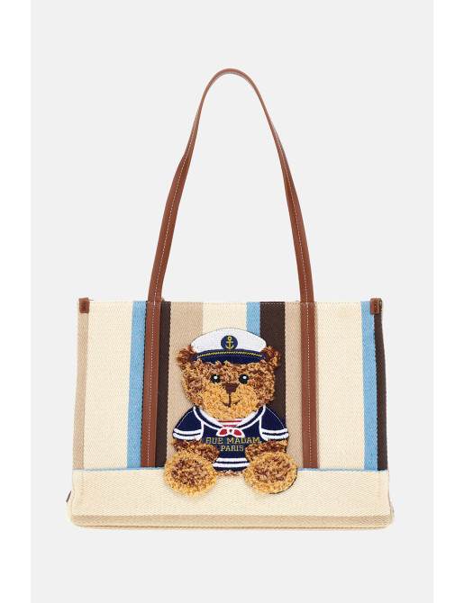 Shopping bag morbida in canvas, dal design giocoso e contemporaneo, arricchita dal nuovo ricamo effetto peluche dell'orsetto Sailor Marvin, che dona un tocco originale e affettuoso. Il fondo a contrasto, insieme ai manici e dettagli in ecopelle, valorizza la struttura con eleganza. Chiusura con zip e fodera interna in cotone con tasca, ideale per una pratica organizzazione quotidiana. Dimensioni L 36 x H 27 x P 15 cm