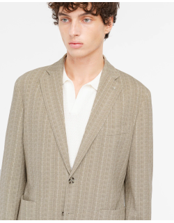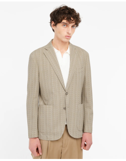 Giacca NUVOLA drop 8 sfoderata in jersey, chiusura due bottoni, due tasche a toppa e un taschino frontali, due spacchi sul retro, quattro bottoni ai polsi, finiture con impunture. Riga in jersey misto cotone stampato
