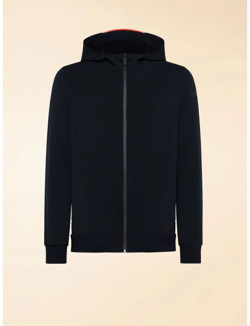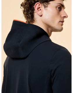 Disegnata per vivere intensamente le giornate primaverili, questa felpa con cappuccio interpreta l'activewear contemporaneo con stile essenziale. Il taglio regolare garantisce comfort e libertà di movimento, mentre il tessuto tecnico SURFLEX® elasticizzato e smerigliato, dal finish opaco, avvolge il corpo con leggerezza e morbidezza. La zip anteriore e le zip invisibili delle tasche laterali definiscono una linea pulita. Il sottile bordo sul cappuccio e la nastratura arancione fluo sul retro introducono un deciso accento grafico, aggiungendo un tocco di ispirazione marina all'estetica urbana. L’interno del cappuccio è totalmente termonastrato, mentre le lavorazioni a costina inglese elasticizzata sui fianchi, polsi e fondo perfezionano la vestibilità, garantendo una silhouette agile e impeccabile. Il logo a microiniezione nero sulla manica sinistra completa con una nota distintiva questa creazione, pensata per chi vive la città con uno spirito dinamico.