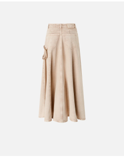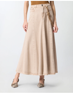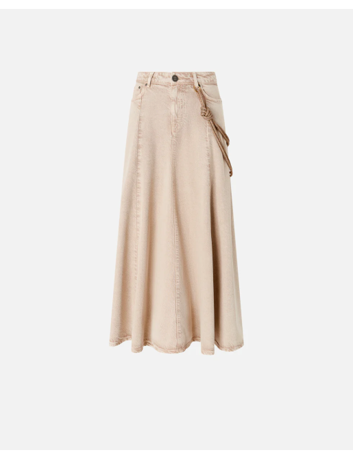 Gonna midi a cinque tasche realizzata in bull denim di cotone e lyocell dalla mano fluida e caratterizzata da una linea leggermente svasata con morbide pieghe sul fondo. Dotato di una comoda chiusura frontale con zip nascosta e bottone a vista, il modello è decorato da un dettaglio speciale: una corda gioiello rimovibile da attaccare al passante frontale e sul retro, illuminata da piccoli strass. Rifinisce il design il logo Love Birds ricamato in tono su una delle tasche posteriori. La gonna è ideale in abbinamento con una camicia per un outfit quotidiano dal touch femminile e personale, da indossare anche in ufficio