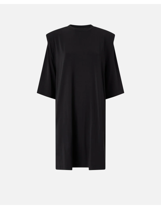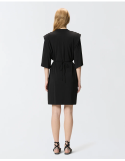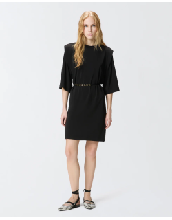 Abito corto girocollo con ampie maniche a tre quarti, realizzato in jersey crêpe stretch dall'aspetto lucido simile alla seta. Il capo presenta una silhouette dritta e morbida, resa più decisa dalle spalline interne strutturate, ed è completo di una cinturina rimovibile in vita con parte frontale in tessuto, da annodare a proprio gusto, e parte posteriore a catena, per un dettaglio grintoso che esprime il DNA PINKO. Questo vestito diventerà il tuo alleato ideale sia per un look da giorno femminile, con un paio di scarpe basse, sia per una serata speciale, con un paio di décolleté